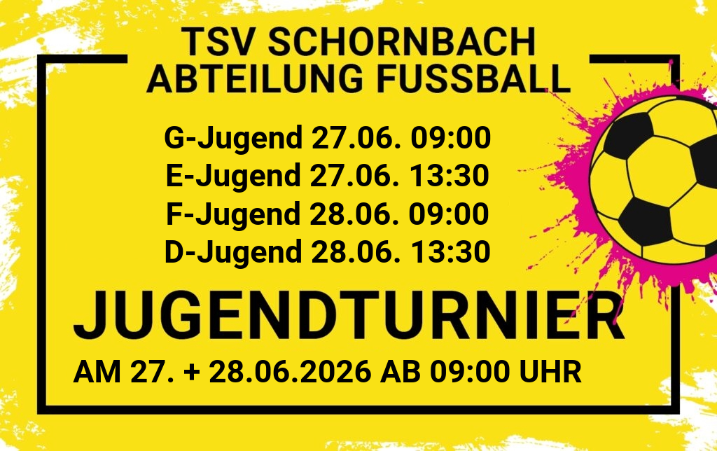 Sommerturnier D-Jugend Termin Details Datum: 28. Juni 2026 13:30 – 17:30 Ort: Zuhause beim TSV Schornbach Terminkategorien: Jugend Teilnehmer: TSV Schornbach Sponsored by